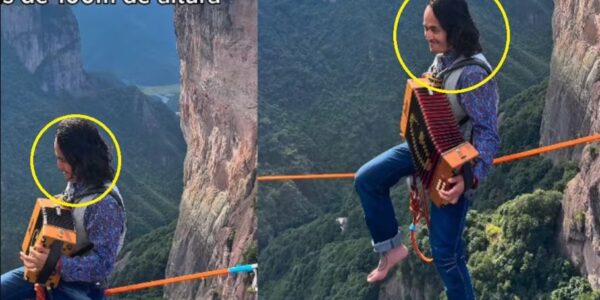 Joven se vuelve viral al tocar el acordeón a 100 metros de altura, sentado sobre una cuerda