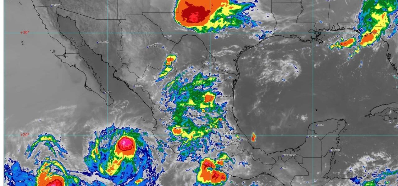 Otros canales de baja presión sobre el norte y centro del territorio nacional, en combinación con la entrada de humedad del océano Pacífico, golfo de México y mar Caribe, y con inestabilidad atmosférica, producirán chubascos y lluvias fuertes, descargas eléctricas y posible caída de granizo en entidades de la Mesa del Norte y Mesa Central, pronosticándose lluvias puntuales muy fuertes en Durango, Zacatecas, Aguascalientes, San Luis Potosí y Guerrero.