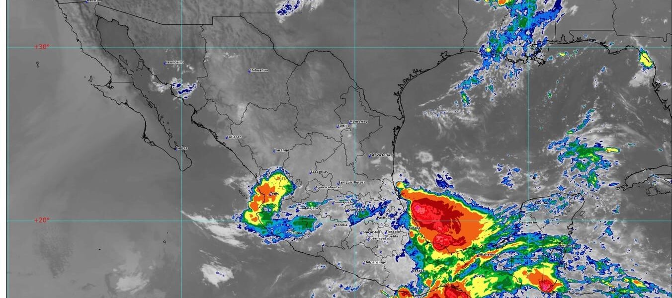 Simultáneamente, un canal de baja presión se extenderá sobre los estados de la Mesa del Norte y la Mesa Central, en interacción con una vaguada en altura, inestabilidad atmosférica y el ingreso de humedad del océano Pacífico y golfo de México, ocasionarán chubascos y lluvias puntuales fuertes en las regiones mencionadas; con lluvias puntuales muy fuertes en Michoacán, Estado de México y Puebla.