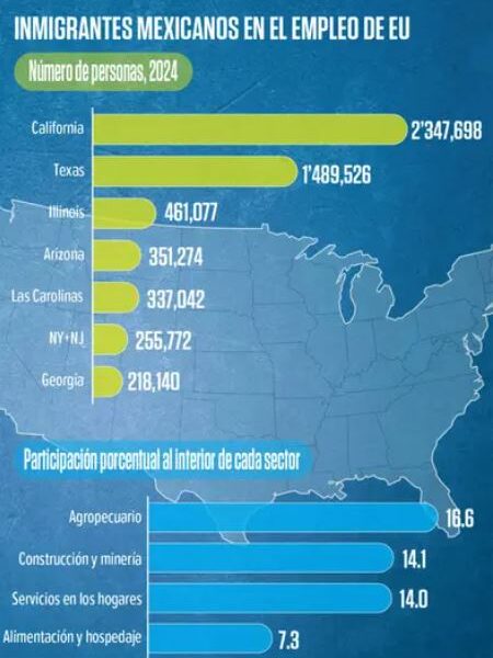 De acuerdo con el Centro de Estudios Monetarios Latinoamericanos (Cemla), la fuerza laboral de inmigrantes mexicanos en Estados Unidos est谩 concentrada en 12 estados de la Uni贸n Americana que, en 2024, dieron empleo a 80% de los trabajadores mexicanos inmigrantes en EU, un promedio de seis millones de personas.