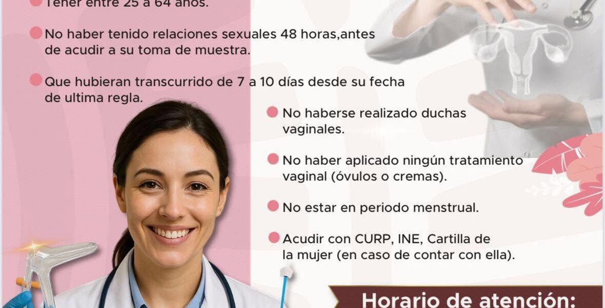 Los requisitos incluyen tener entre 25 y 64 años, cumplir ciertas condiciones previas al estudio —como no estar en periodo menstrual ni haber tenido relaciones sexuales en las últimas 48 horas—, y presentar CURP o INE.