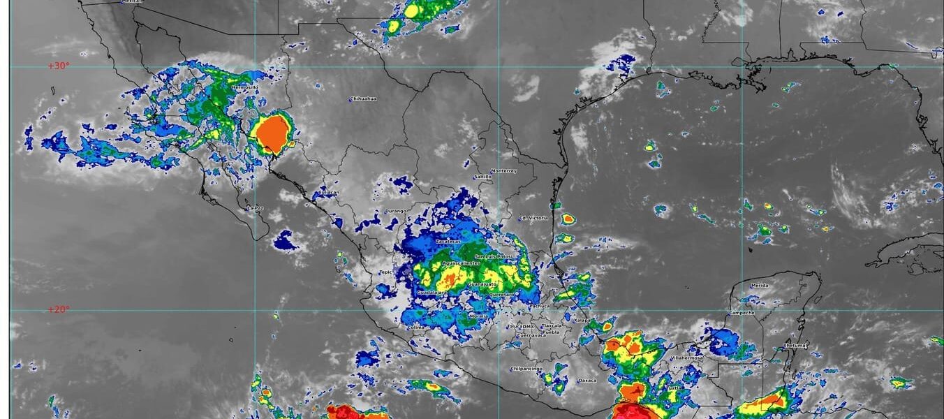 Chubascos y lluvias puntuales fuertes en el norte, occidente, centro, oriente y sureste del territorio nacional, incluida la península de Yucatán; con lluvias puntuales muy fuertes en San Luis Potosí, Jalisco, Guanajuato, Querétaro, Hidalgo, Tlaxcala, Puebla, Guerrero, Oaxaca y Chiapas. Todas las lluvias de acompañarán con descargas eléctricas, rachas de viento y posible caída de granizo.