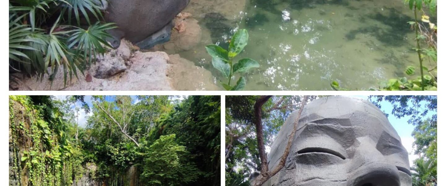Al cruzar la entrada, como si de un portal se tratara, debes bajar unas cortas escaleras para adentrarte al túnel que termina en otras escaleras de regreso a la superficie. Una vez del otro lado, a tu izquierda te encontrarás con la primera instalación: una cabeza maya prehispánica gigante tallada en piedra, que reposa a la orilla de una pequeña laguna natural con agua traslúcida.