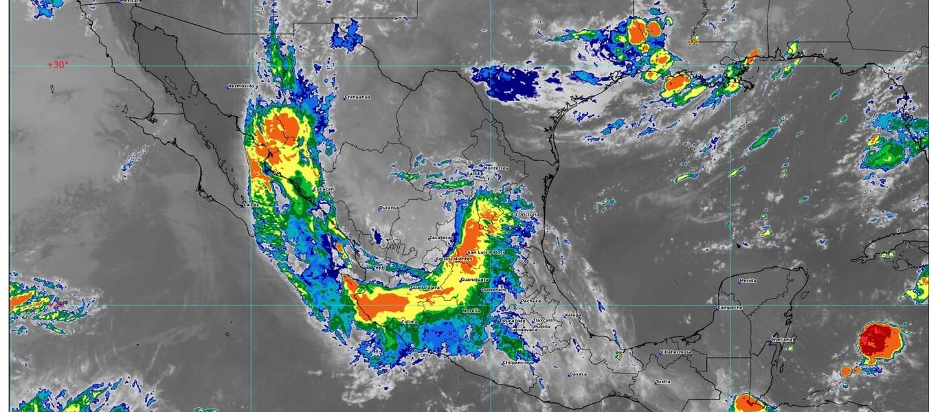 Un canal de baja presión sobre la Mesa del Norte y Mesa Central, en combinación con una circulación ciclónica en altura sobre el occidente del país y con el ingreso de aire húmedo del océano Pacífico y golfo de México, generarán lluvias puntuales muy fuertes en Jalisco; puntuales fuertes en Oaxaca y Zacatecas; lluvias con intervalos de chubascos en Puebla, Tlaxcala, Morelos, Ciudad de México, Estado de México, Hidalgo, Querétaro, Guanajuato, Michoacán, Colima, Aguascalientes y San Luis Potosí; así como lluvias aisladas en zonas de Nuevo León y Coahuila.