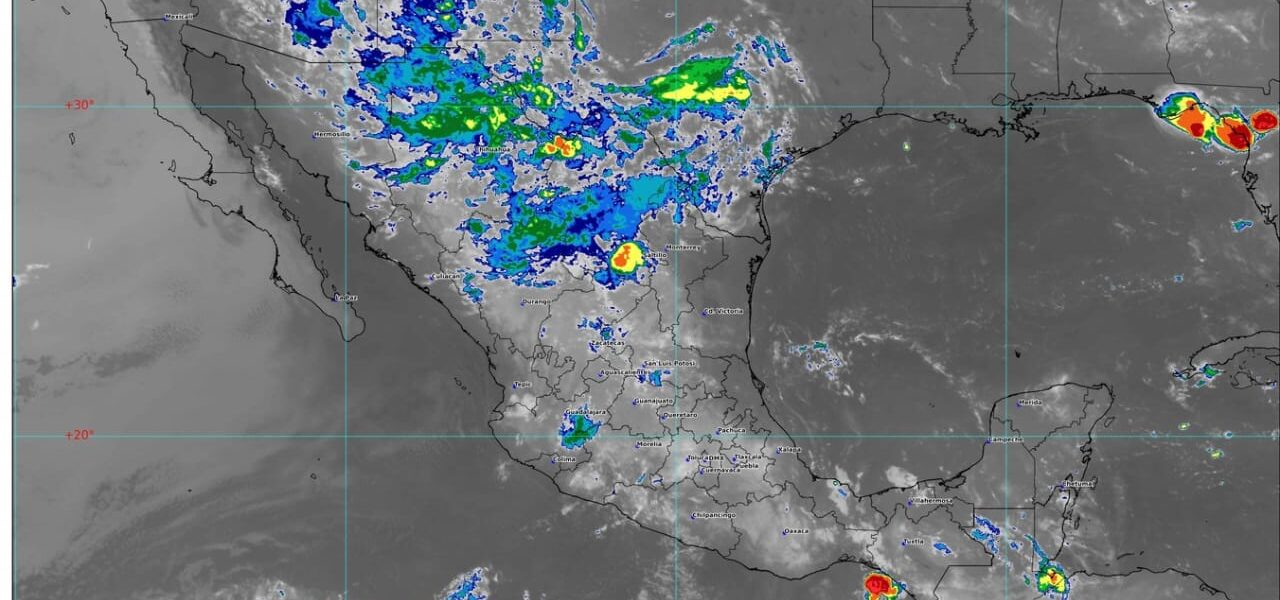 Un canal de baja presión sobre la Mesa del Norte y la Mesa Central, en combinación con inestabilidad atmosférica en el noreste de México y con ingreso de aire húmedo del golfo de México, producirán lluvias puntuales muy fuertes en Coahuila; puntuales fuertes en Puebla, Guerrero, Michoacán, Colima, Jalisco y Zacatecas; intervalos de chubascos en Tlaxcala, Morelos, Estado de México, Guanajuato, Aguascalientes, San Luis Potosí y Nuevo León; y lluvias aisladas en la Ciudad de México y zonas de Querétaro, Hidalgo y Tamaulipas.