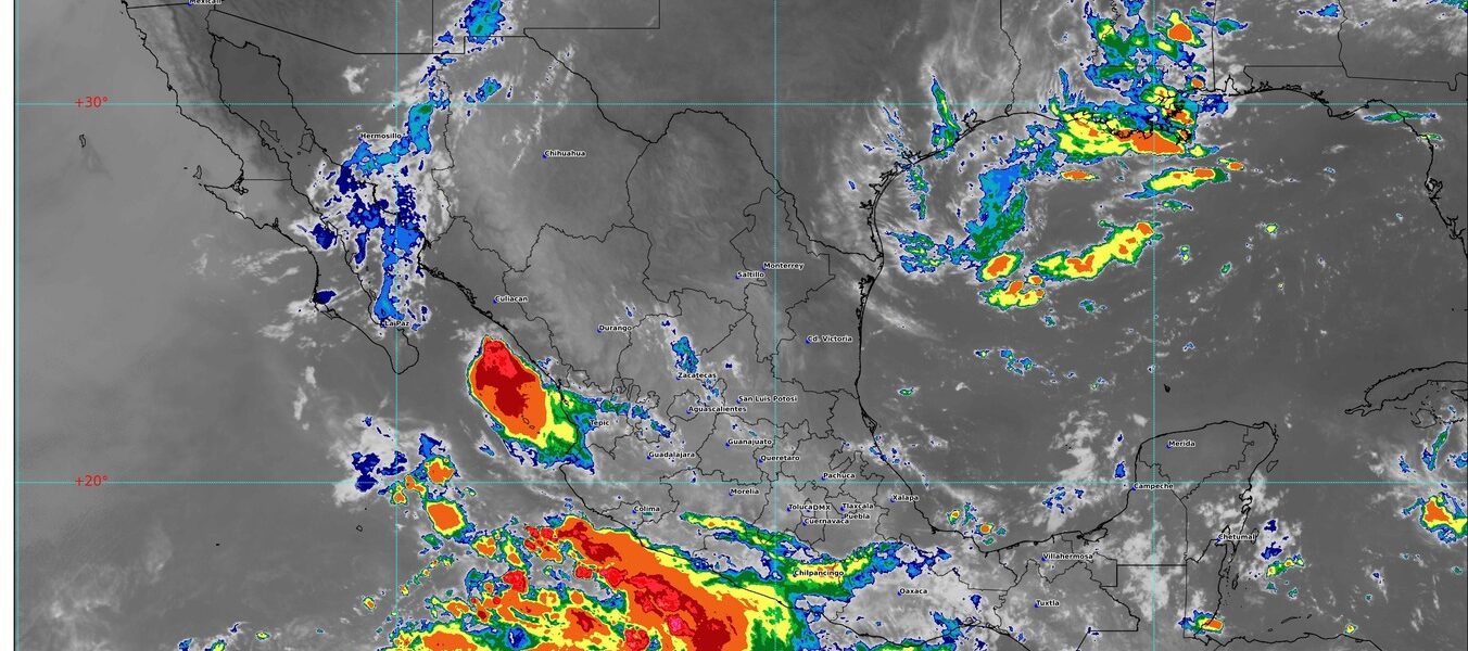 Sobre la Mesa del Norte y la Mesa Central, un canal de baja presión, una vaguada en altura y la entrada de aire húmedo desde el Pacífico ocasionarán lluvias intensas en Jalisco, y muy fuertes en Guerrero, Michoacán y Colima.