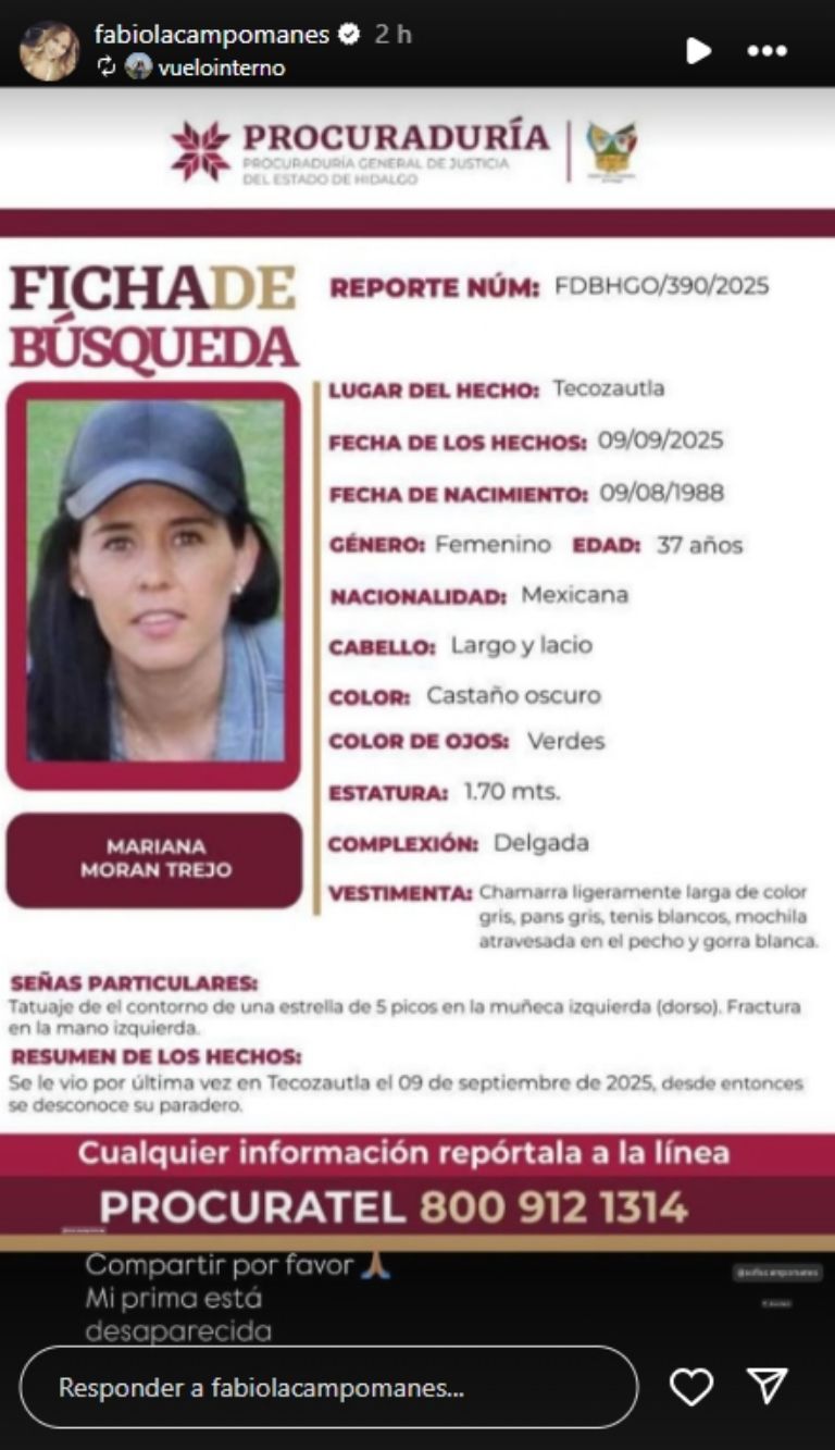 En el boletín de las autoridades del estado de Hidalgo se detalló que Mariana Moran Trejo de 37 años de edad, prima de la actriz y conductora de televisión, Fabiola Campomanes, fue vista por última vez en el municipio de Tecozautla.
