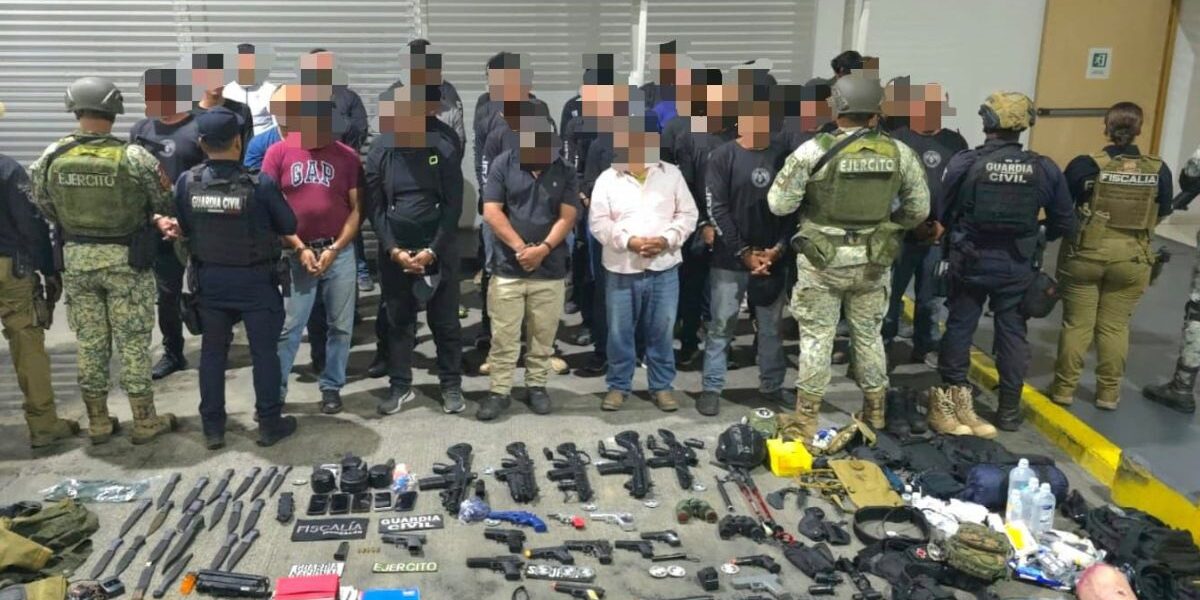 La Secretaría de Seguridad Pública (SSP) de Michoacán informó el aseguramiento de 38 hombres, entre ellos un ciudadano estadounidense, así como un arma corta y 19 réplicas de arma de fuego, armas blanca, equipo táctico, entre otros objetos.