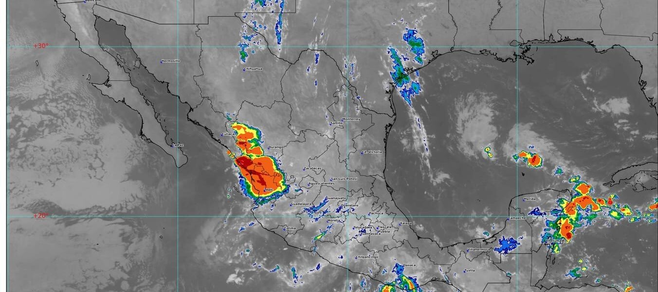 El ingreso de aire húmedo del océano Pacífico y golfo de México, canales de baja presión en el interior del país, así como inestabilidad atmosférica sobre el centro de la República Mexicana, originarán lluvias puntuales muy fuertes en Nayarit y Jalisco; puntuales fuertes en Sinaloa, Durango, Colima y Michoacán; intervalos de chubascos en Puebla, Morelos y Estado de México; y lluvias aisladas en zonas de Tlaxcala, Ciudad de México, Hidalgo, Querétaro y Zacatecas.