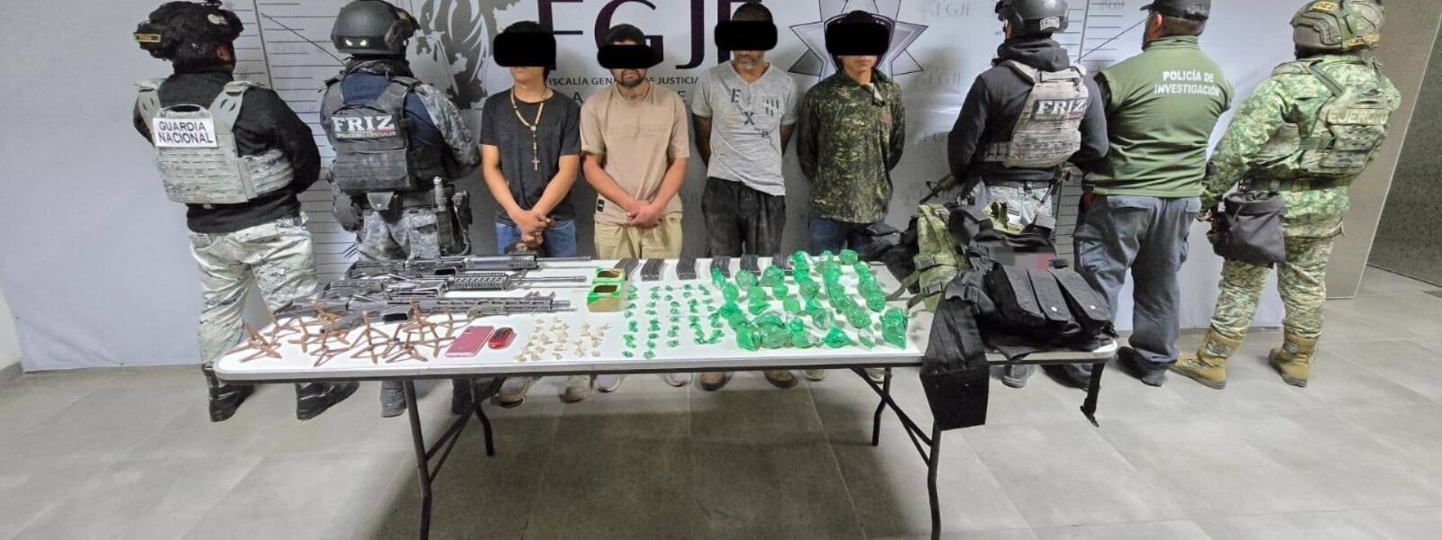 Los cuatro masculinos fueron detenidos y junto con el armamento, droga, explosivos y demás indicios, puestos a disposición de la autoridad competente para la integración de la investigación correspondiente.