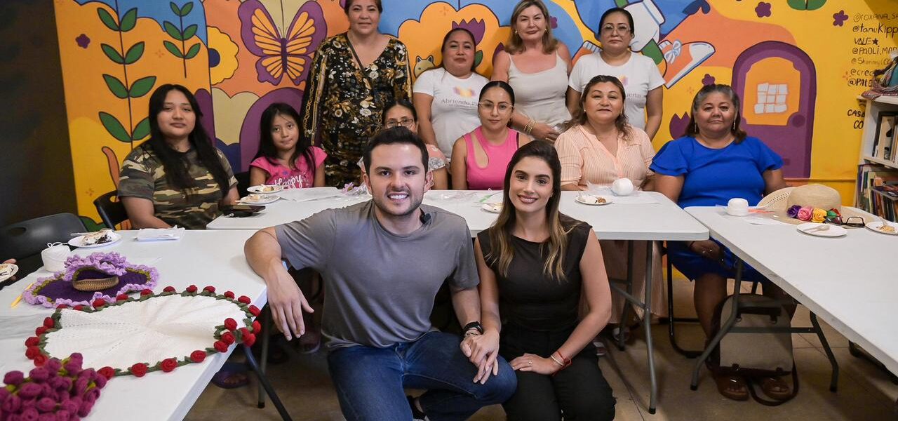 Acompañado de su prometida Libita, el Secretario platicó con beneficiarias y beneficiarios de la asociación, quienes compartieron cómo, a través de talleres de manualidades, costura, asesorías y acompañamiento, han fortalecido sus habilidades y mejorado su bienestar.